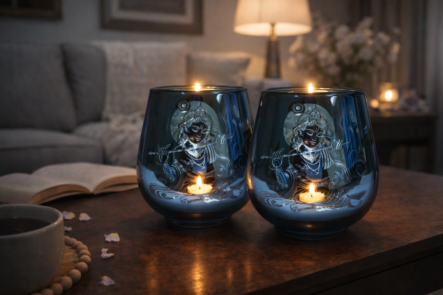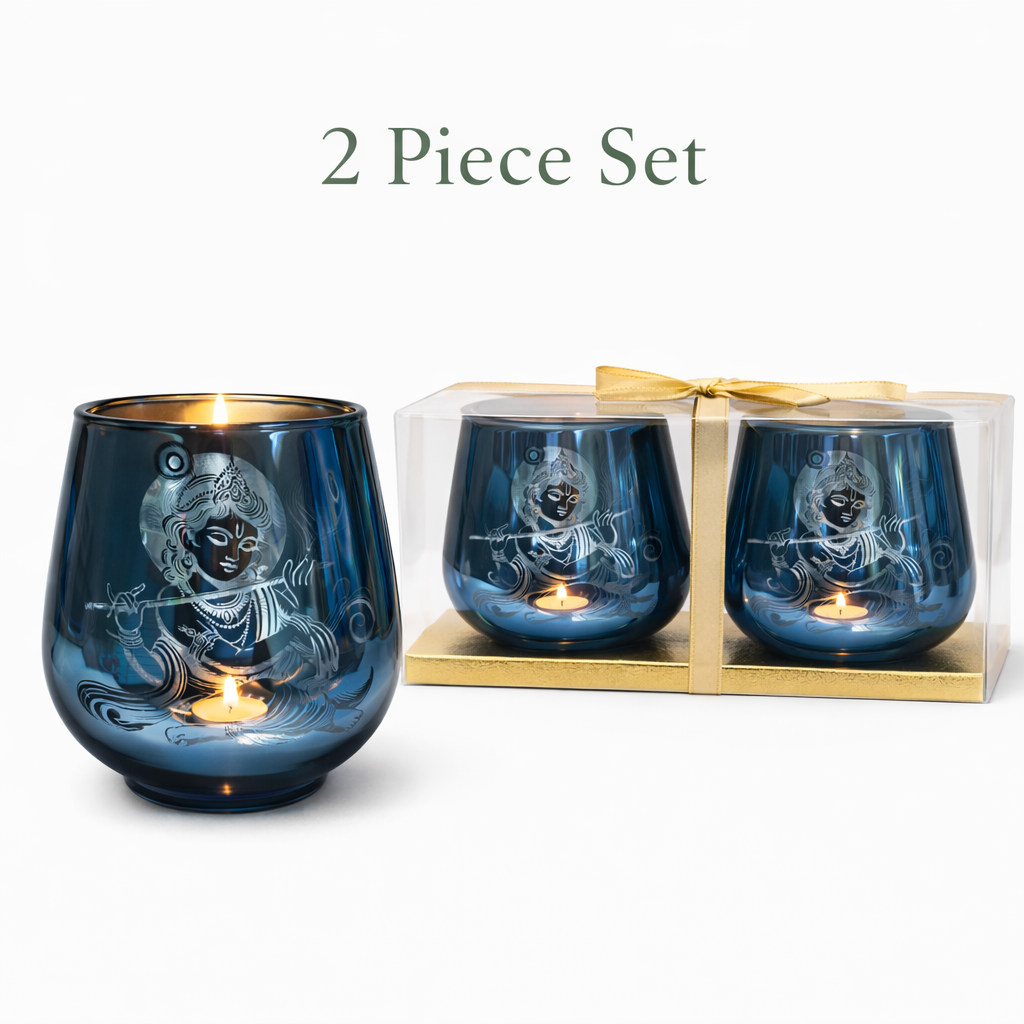 - 4-inch Krishna candle holder; decorative deity design; set of 2 pieces