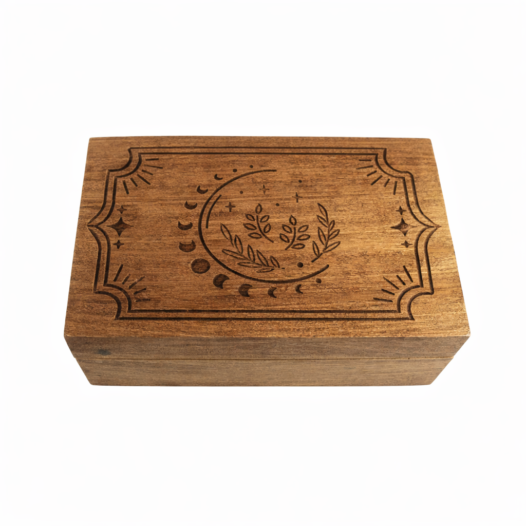 A beautiful and functional storage solution, the Lunar Harvest Wooden Box adds mystical charm and elegance wherever it’s displayed.